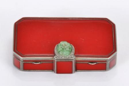 172. Minaudière Art Déco laquée rouge à poussoir en jade