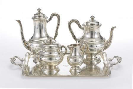 202. Service à thé et café à frise d'oves et motif d'entrelacs et coq...