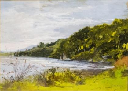 Bord de lac, gouache et aquarelle sur papier signée, 26 x 36 cm