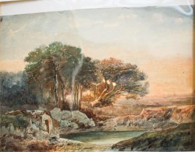 Lac, soleil couchant, gouache sur carton, signé, 30x48 cm