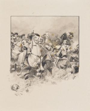 Une bataille au XVIIe s, lavis d'encre, monogrammé, 23x18 cm