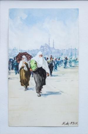 Rue animée à Istanbul, aquarelle et gouache sur papier, monogram...