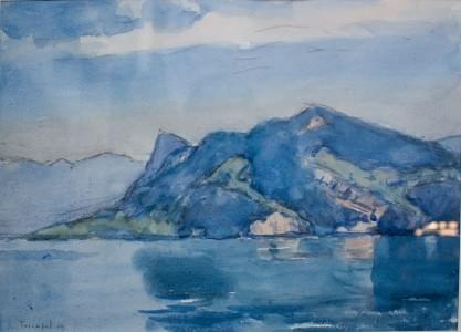 Montagne au bord du lac, aquarelle sur papier signée et datée 49...