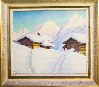Chalets dans la montagne enneigée, huile sur panneau signée F. W...