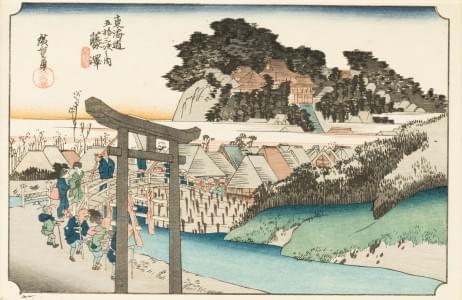 Station du Tokaïdo, estampe en couleurs, 23x37 cm