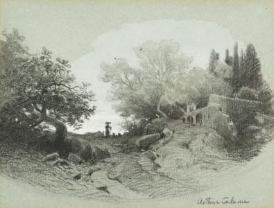 Chemin en lisière de forêt, fusain et mine de plomb sur papier,...