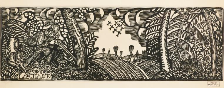 La chasse, linogravure, tampon de l'atelier Raoul Dufy, numéroté...