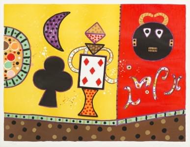 Processo, technique mixte et application feuille or, 1985, 75x65...