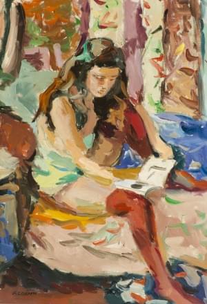 Femme aux bas rouges lisant, huile sur toile signée, 54 x 37 cm