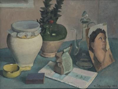 Nature morte au portrait, huile sur toile, signée, 30x40 cm