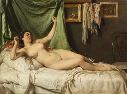 Jeune femme allongée nue, huile sur papier marouflée sur carton,...