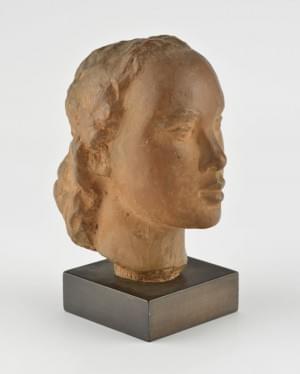 Tête de femme, sculpture en terre cuite ocre, vers 1940, signée...