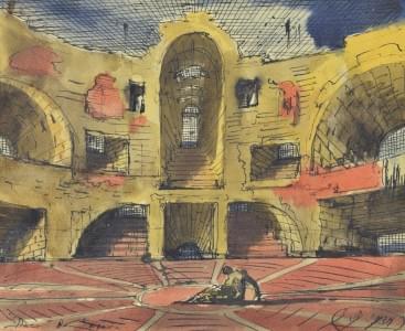 Décor de tragédie, aquarelle et encre sur papier monogrammée tit...