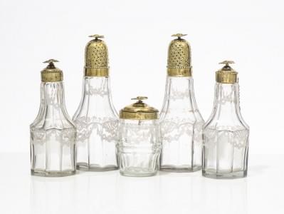 90. Paire de saupoudroirs, deux bouteilles et un flacon en verre gra...