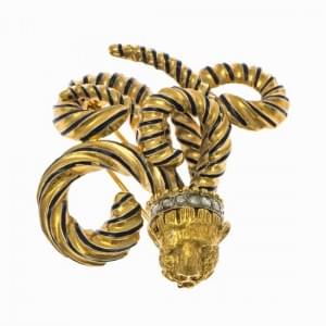 420. Broche émaillée de bleu à motif de tête de lion serti de roses d...
