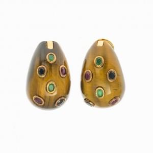 430. Paire de clips d'oreilles en œil de tigre sertis d'émeraudes, sa...