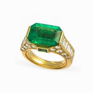 441. Bague sertie d'une émeraude (env 3 ct) épaulée de diamants taill...
