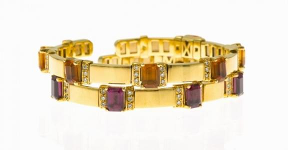 444. Paire de bracelets jonc ouverts sertis de citrines, grenats alma...