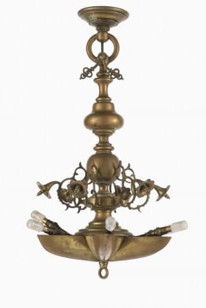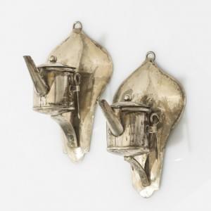 628. Paire de lampes à huile d'applique en forme de théière sur médai...