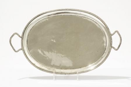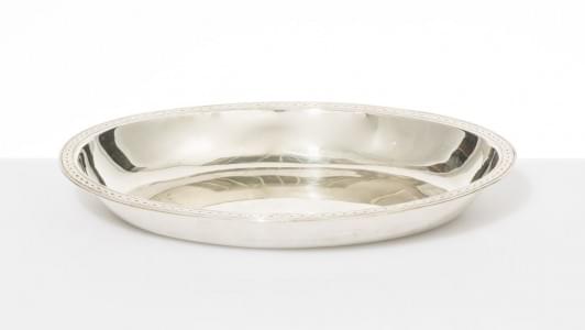 638. Plateau de théière ovale à bordure gravée d'entrelacs,