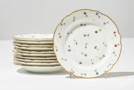 647. Suite de 11 assiettes à dessert décorée de semis de fleurs bleue...