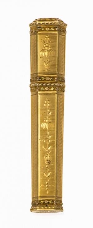 655. Etui à cire trois ors à motif guilloché et gravé d'une tige fleu...