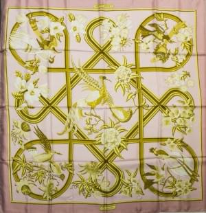 A décor d'oiseaux, fleurs et coquillages jaunes sur fond rose, s...