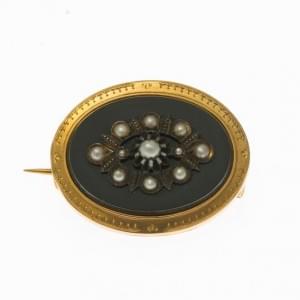 3044. Broche ovale formée d'une plaque d'onyx sertie de demi-perles