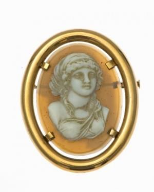 3050. Broche sertie d'un camée d'imitation figurant un buste de jeune...