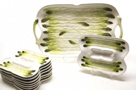 3141. 8 assiettes et 1 plat à décor d'asperges en trompe l'œil