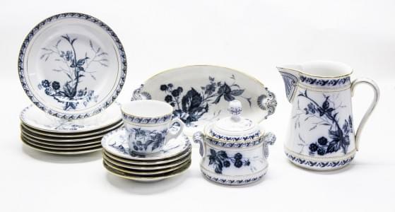 3183. Service à dîner à décor blanc bleu de rameaux et rosaces « blau...
