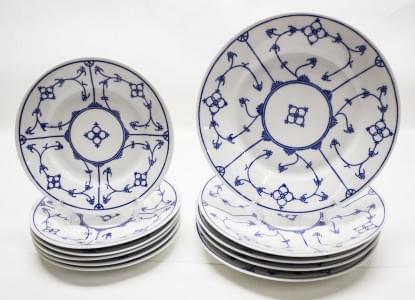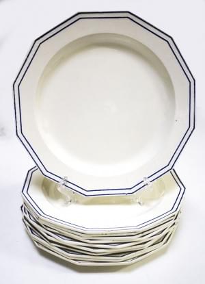 3156. Onze assiettes dodécagonales blanches avec liseré bleu