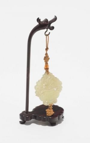 Ivoire sculpté et cabochons de turquoise, Chine, 11,5x12 cm