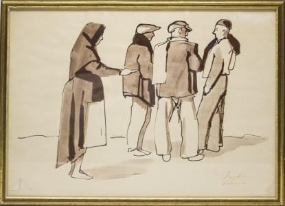 Soldats sur la plage, encre et aquarelle sur papier signée, 23x3...