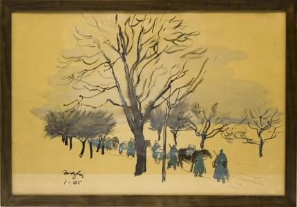 Soldats en chemin, encre et aquarelle sur papier, signée et daté...