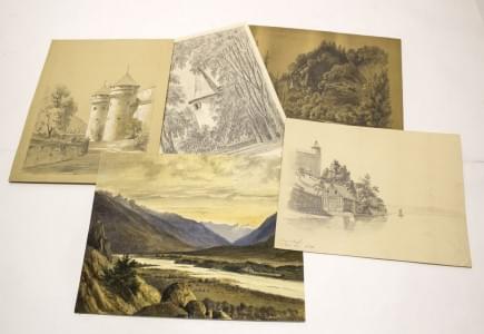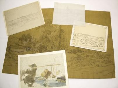 Ensemble de sept dessins de paysages, fusains, mine de plomb et...