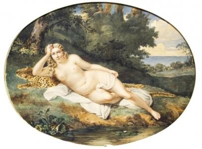 Nu féminin allongé sur une peau de léopard, aquarelle sur papier...