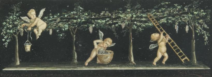 Putti forgeron, putti justicier et putti vendange, trois gouache...