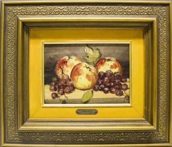 Nature morte aux pommes et raisins, huile sur panneau, porte une...