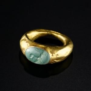 1018. Bague sertie d'une intaille sur calcédoine bleue de style romain