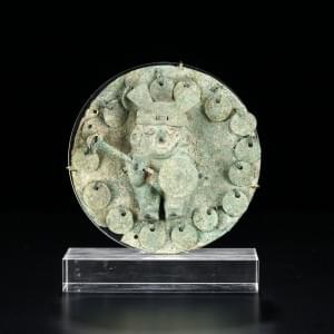 991. Plaque circulaire à décor d'un guerrrier, Pérou, 600 av-600 ap....
