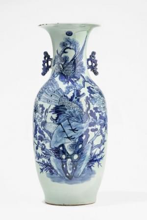 Porcelaine à décor bleu blanc de paons sur fond céladon, H 58 cm