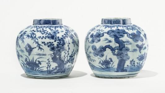 Porcelaine blanc bleu à décor des trois amis (prunus, bambou et...