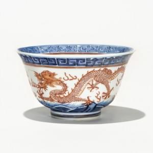 Porcelaine à décor bleu et rouge de dragons, D 11,5 cm
