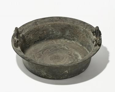 Bronze patiné à décor en léger relief de poissons, H 17 cm, D 40...