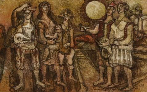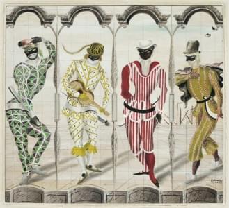 Quatre personnages de la comedia del arte, aquarelle et gouache...