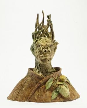 Buste d'un personnage grotesque à décor de citrons, céramique ém...