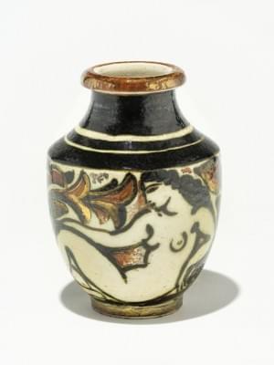Vase balustre, céramique à décor émaillé de femmes, col rayé noi...