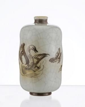Vase bouteille sur talon à décor de cygne et poisson en camaïeu...