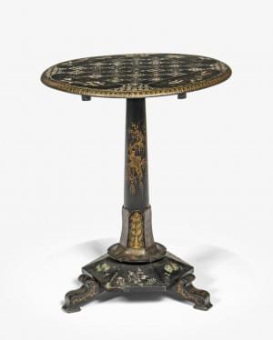 Pied tripode, décor de damier, chinoiseries et fleurs, marqueté...